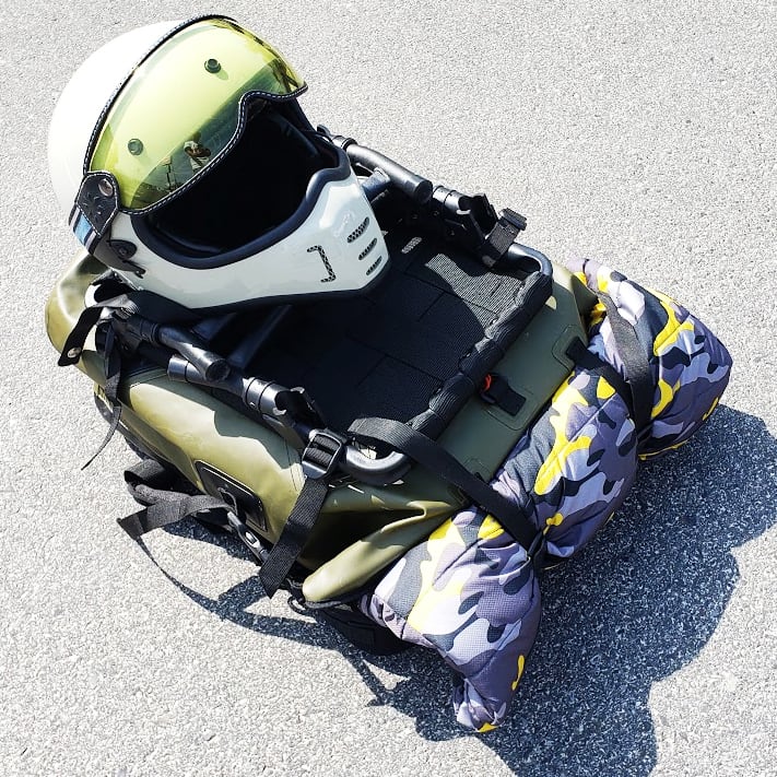 ただしバイクのシートに積む場合は折り畳まずに広げた脚の間にバッグを挟んだり、荷物を押さえるように固定することで走行時の積載物の安定感がアップに役立ちます。