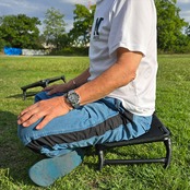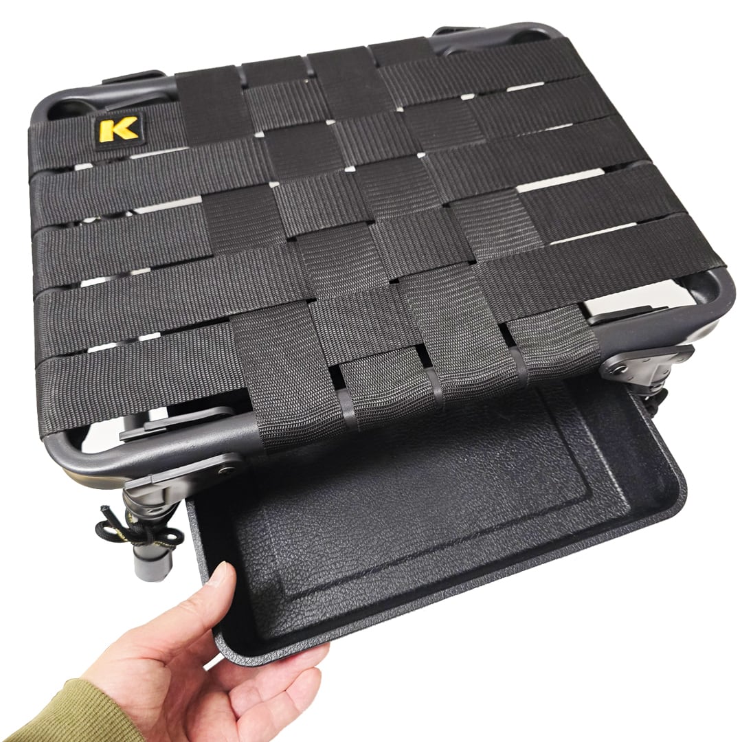一般的な後ろ荷重のホールディングチェアーとは異なり焚火台を使った調理、バトニング、フェザー作りの際にも前荷重で楽な姿勢で作業が出来るポジショニングが特徴です。