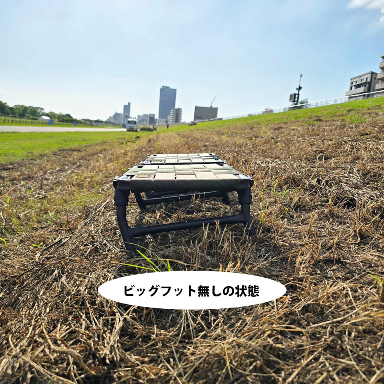 また付属するフットエンド3個を取り付けることで地面に対して座面を凡そ水平に保つことが出来、ローテーブルとして食品や食器や調理器具、バッグやクーラーボックス等を直接地面に置きたくない場合に大変役立ちます。