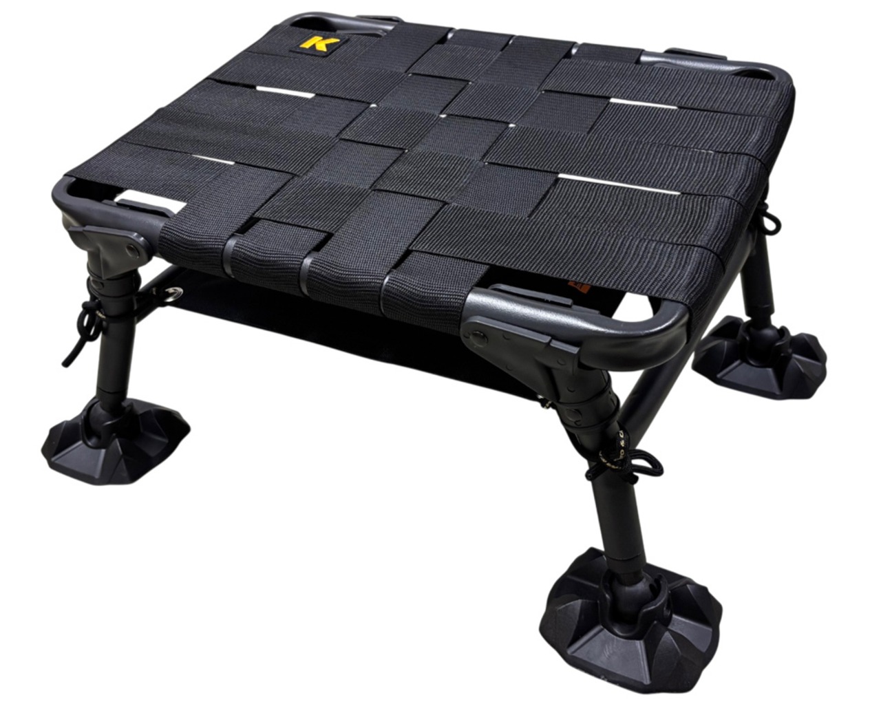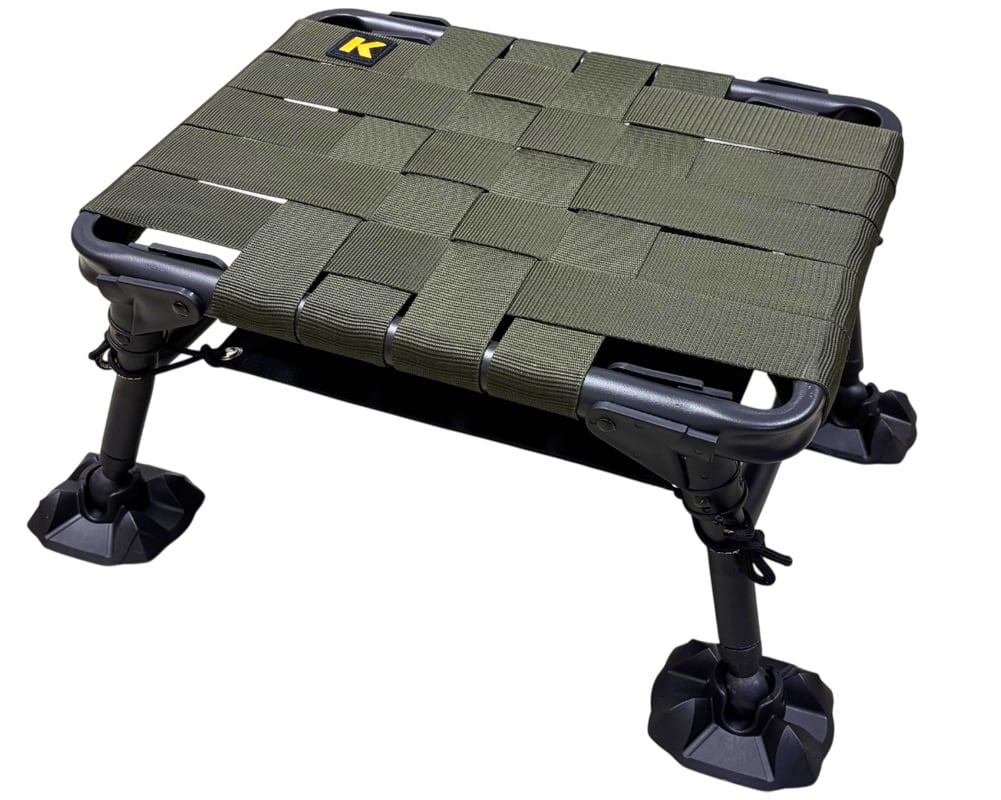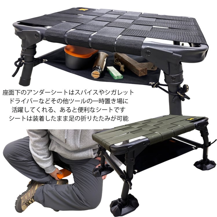 前荷重で下半身に少し前傾で傾斜を付ける事により楽な姿勢ながら焚火台での調理やフェザースティック作り/バトニングなど各種作業が行いやすいポジショニングが特徴のチェア