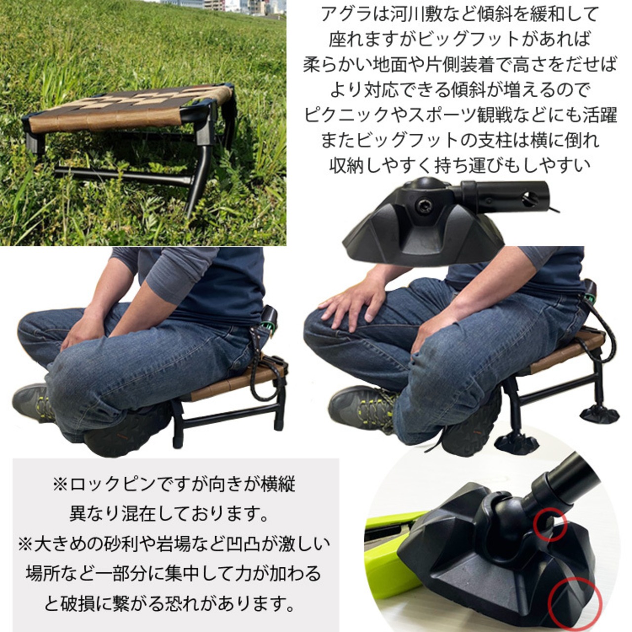 ビッグフットは柔らかな地面での脚部沈下で座面下がりを防ぐと共に微妙な地面の凹凸に対応
